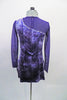 Pretty, tunic dance dress with blue mesh sleeves, shoulder and upper chest. The unique, asymmetrical design compliments the crushed velvet base of the dress resembling a blue nebula, which is lined with a multitude of crystals and crystal accent on left shoulder. Comes with crystal hair accessory.